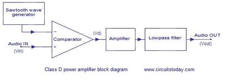 Since most audio signals are not pulse trains, a modulator must be included to convert the audio input into pulses. The amplifier can be single stage or multistage depending upon the need of the circuit. The figure below shows the block diagram of an amplifier: Power amplifier circuits (output stages) are classified as a, b, ab and c for linear.