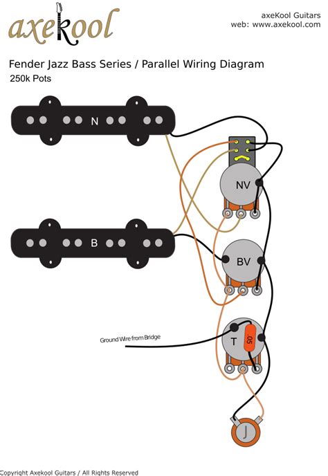 Unlike most other guitar wiring, the output wires from the pickups connect to the middle lugs of the volume pots, letting you turn the volume of one pickup down without affecting the other. This wiring uses a push/pull pot to switch the two pickups from parallel to series using a push/pull pot. Basically, jazz bass pickups are wired in parallel,.